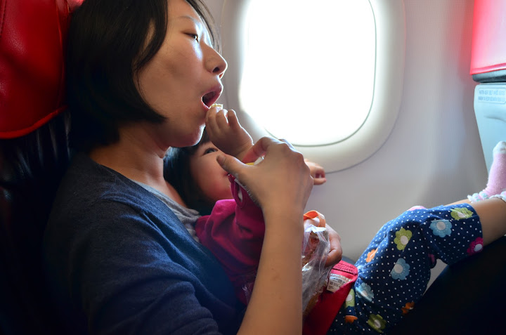 I had heard that sucking on a pacifier helps, which is kind of one of the reasons why we haven’t exactly weaned her off of it yet. At least that’s the excuse I’m using. I also heard eating would help alleviate some of the pressure. So during take-off, we start shoving pieces of bread in her mouth, and when she had had her fill, we popped that pacifier in.